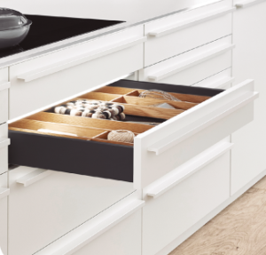 Guías invisibles de cajón metálicas de extracción total y cierre amortiguado. Gran capacidad de carga, hasta 40Kg, base y trasera de melamina de 16mm.